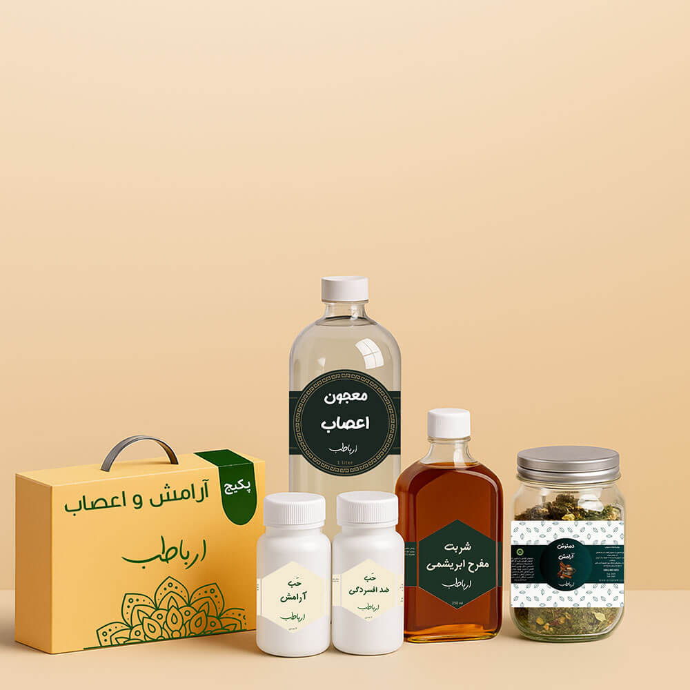 پکیج کامل آرامش و اعصاب ارباطب شامل پنج محصول اصلی است که هر کدام به طور تخصصی برای ایفای نقشی خاص در فرایند آرام سازی اعصاب،کاهش اضطراب،بهبود خلق و خو و ارتقای سلامت کلی و سیستم عصبی طراحی شده اند.این محصولات به صورت یک سیستم درمانی جامع عمل می‌کنند: